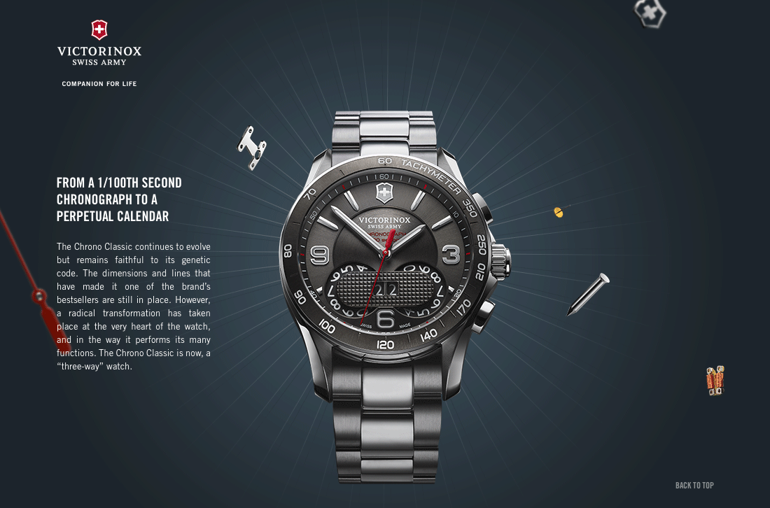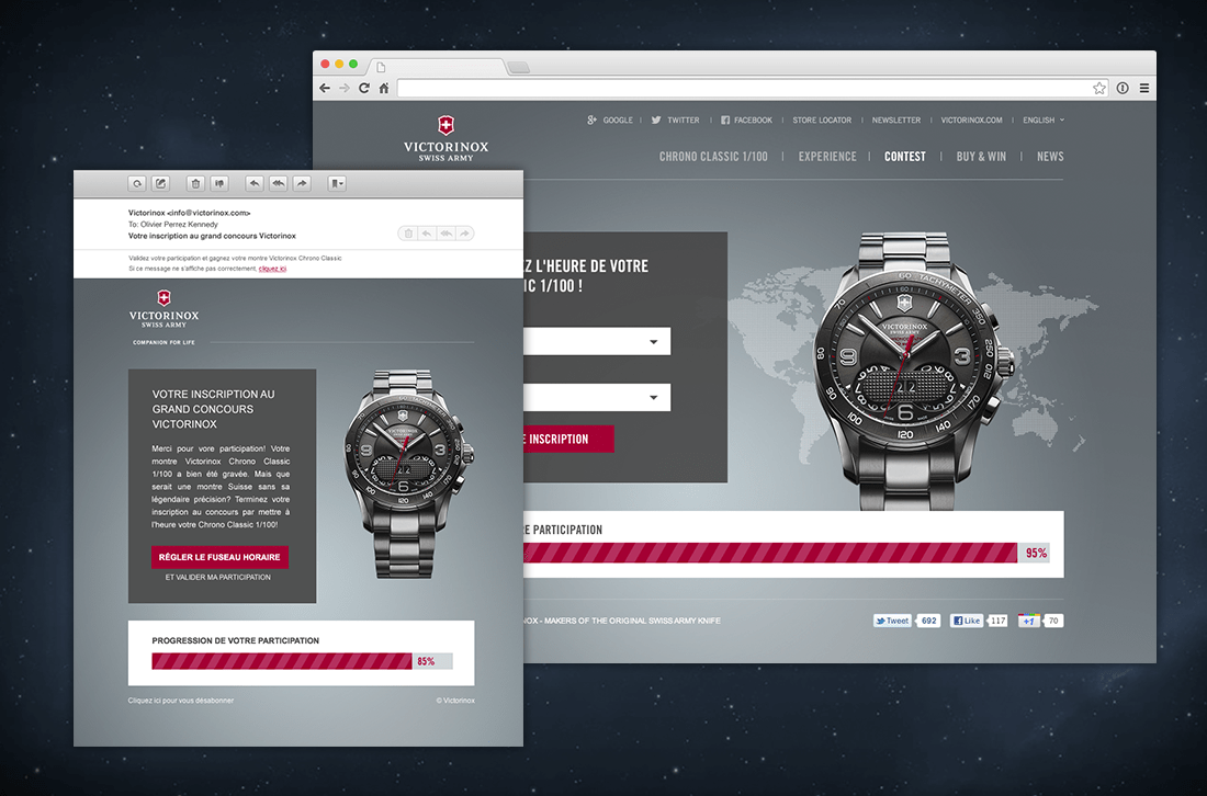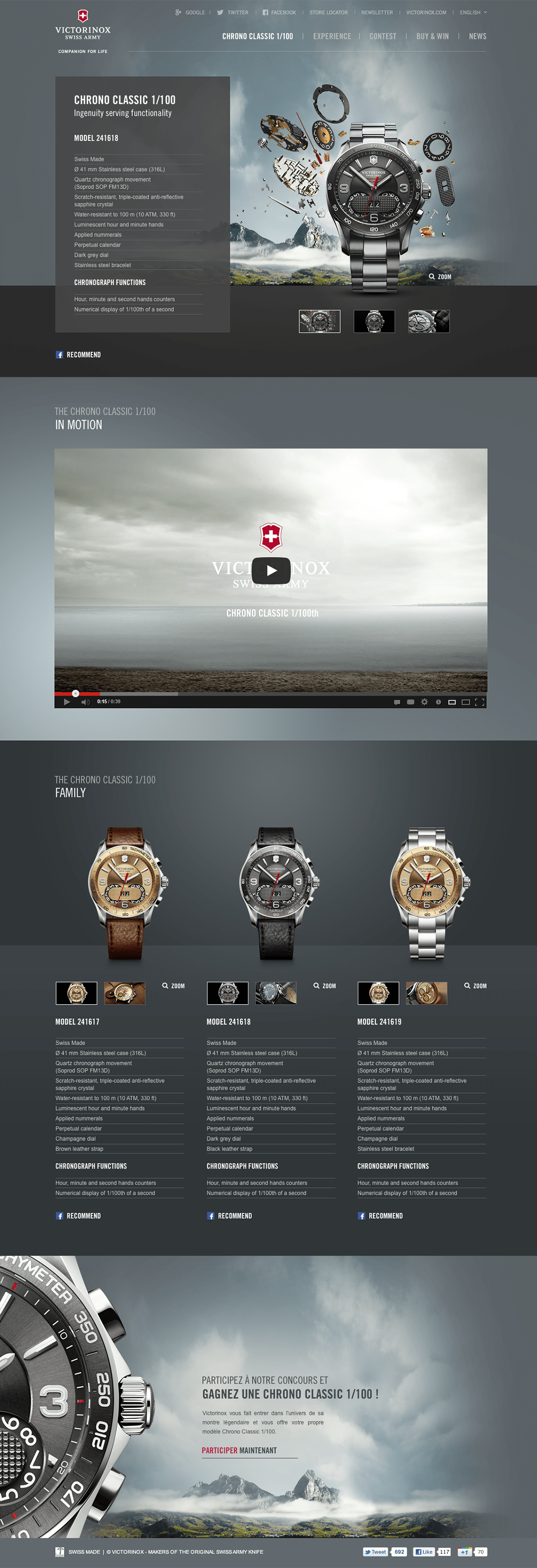 The launch of the product was a huge sucess and exceeded the client’s expectations. More than 30’000 people enriched the Victorinox client database. 15’000 new facebook fans were generated and more than 8’000 of the existing fans were linked to new records in the client database. The website also won prizes and awards, including the prestigious CSS Design Awards Site Of The Day.